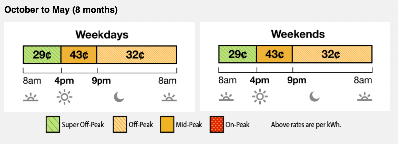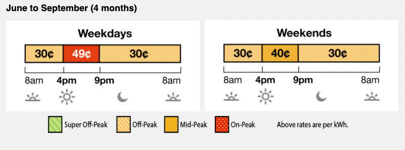 With TOU, you are charged different rates depending on when you use power. I am on the 4pm to 9pm for peak rates plan, there is also a 5pm to 8pm and another plan that is for people who have an Electric Vehicle (EV).
