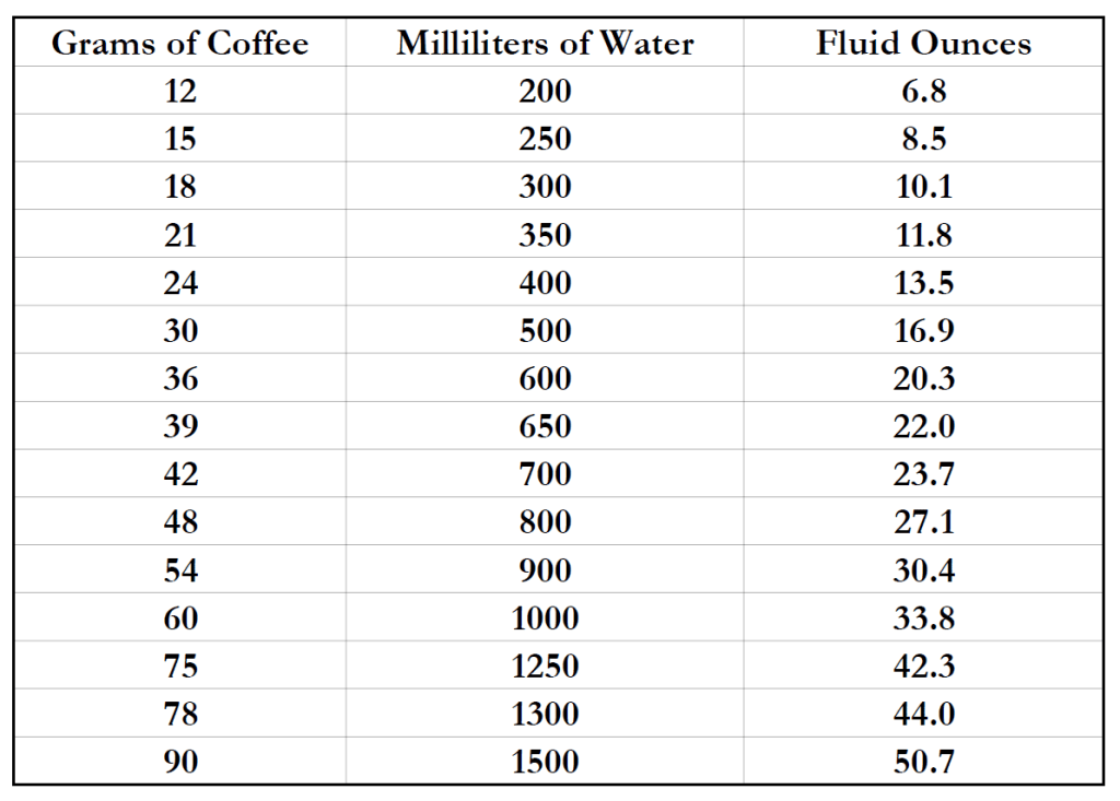 Based off the most commonly suggested ratio of 60 grams per 1 liter of water or ≈ 1:16.7 Ratio. For French Press or other immersion methods you can try up to 75 grams per 1 liter to your taste. Coffee ratios vary between 1:13 to 1:18.